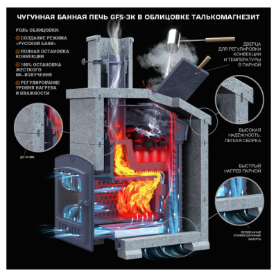 Основной материал топки печи — чугун, что гарантирует высокую теплоемкость и долговечность. Чугунная топка отличается способностью длительно сохранять и равномерно распределять тепло, что способствует созданию оптимальных условий для парения.