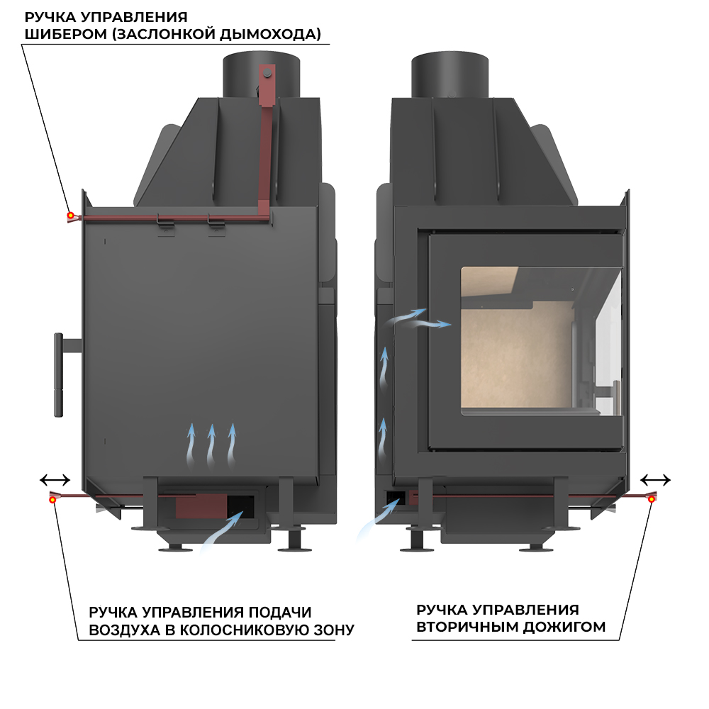 Регулирование тяги возможно с использованием шибера, встроенного в патрубок дымохода диаметром 150 мм. Ручка управления шибером размещается на передней поверхности топки, справа вверху.